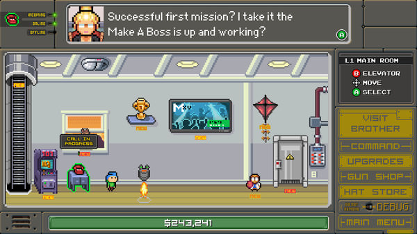 During your journey you will battle bosses you created with the Make-A-Boss generator. You engage in combat, chase and missions to recue baby robo-AI’s from the clutches of the biggest baddie of all, the dreaded Boss 101. Game rounds reward the player with cash for upgrades, guns and hats, all of which help you fight tougher bosses.
