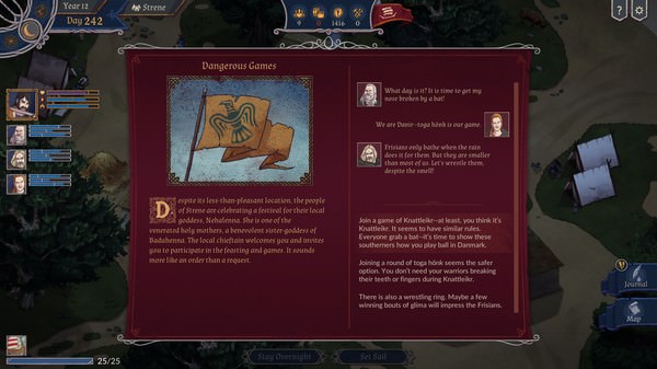 Gameplay is split into two seasons. Winter to manage and plan for the year ahead and summer when you sail the whale road and visit other towns and villages. You and your warband have to fulfill a quest each year, while ensuring that you have sufficient food to feed everyone through the long months of winter. Digitally hand-drawn locations are connected by an atmospheric side-scrolling sailing mode. Grid based tactical combat means that Valhalla can be just a warcry away.